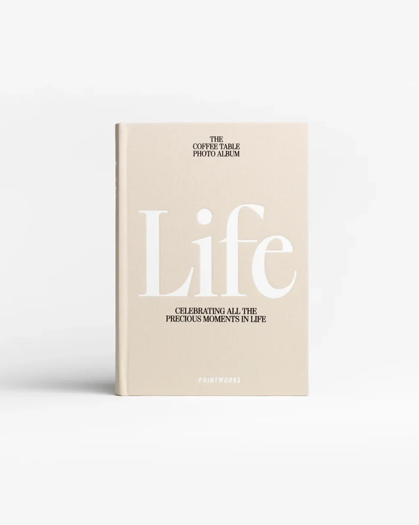 Discover our bestselling photo book Life, featuring a beautiful hardcover bookshelf design covered in beige cloth with white text.